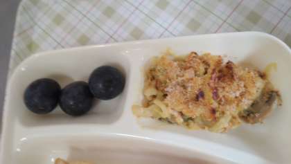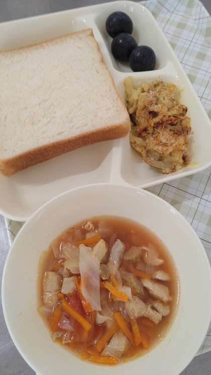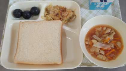 今日の給食は、豆乳マカロニグラタン(米粉)、トマトスープ、ぶどう(巨峰)、パン、マーマレード、牛乳です。