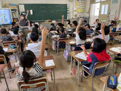 外国語の学習をしました。「I like 〜」(〜すき)「I don’t like」(〜がにがて)を学習しています。テレビの人物がすきかきらいかを予想するゲームもしました。