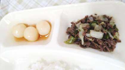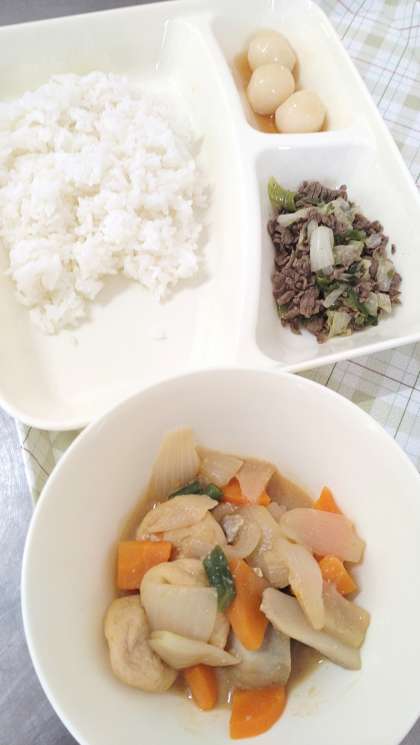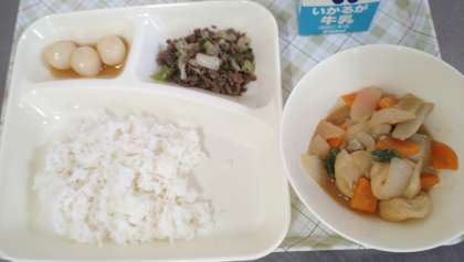 今日の給食は、一口がんものとさといものみそ煮、牛肉と野菜のいためもの、みたらしだんご、ごはん、牛乳です。