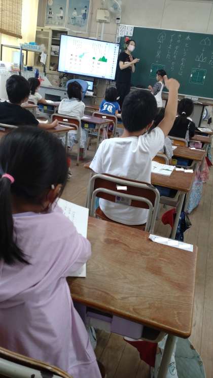 「かんじのおはなし」の学習をしました。「山」と「木」の漢字がどのようにしてできたか話し合い考えました。