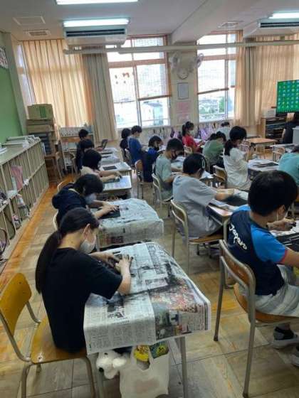 図画工作で「けしてかく」をしました。黒く塗った紙を消しゴムで消して描いていく作品を作りました。