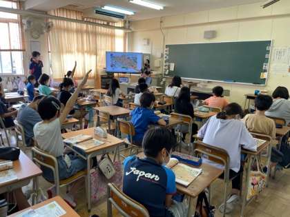 5年生は、外国語を学習しました。テレビに映っている絵を見て、何をしているか英語で発表していました。今日は、ライザさんがきて学習しました。