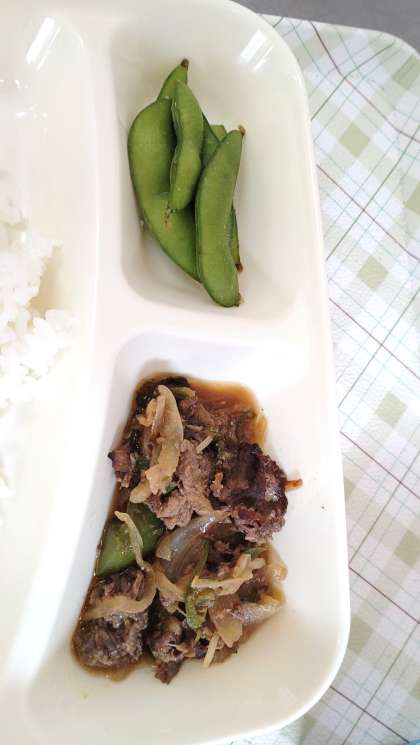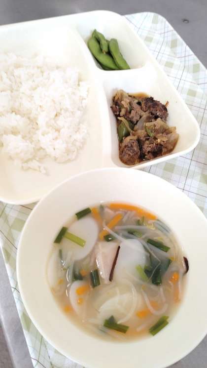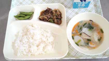 今日の給食は、プルコギ、トック、えだまめ、ごはん、牛乳です。