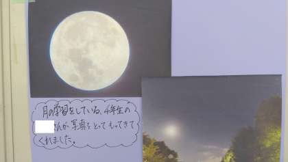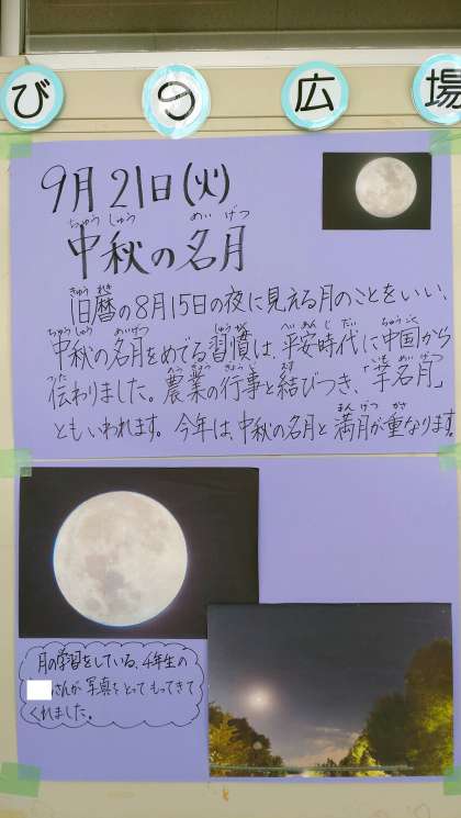 現在、理科で月の学習をしている4年生の児童が、中秋の名月の写真を撮って持って来てくれました。満月となる中秋の名月は、8年ぶりだそうです。