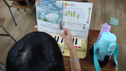 鍵盤ハーモニカの演奏をしました。旋律遊びで、いろいろな音のつなげかたをためしています。