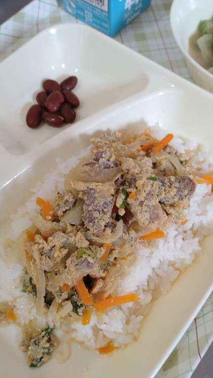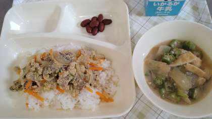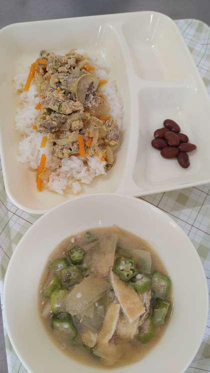 今日の給食は、他人丼、とうがんのみそ汁、金時豆の煮もの、牛乳です。