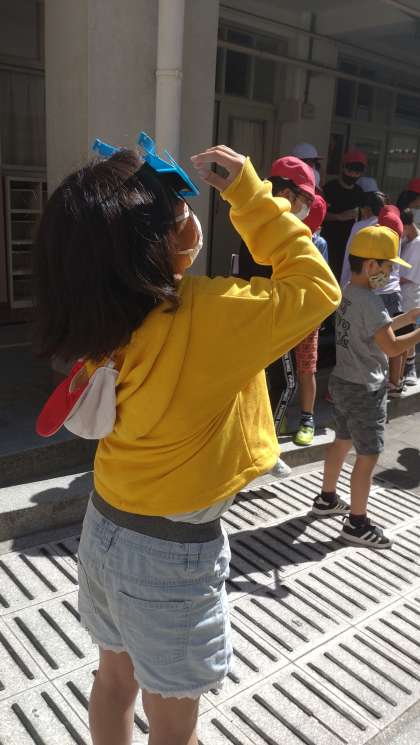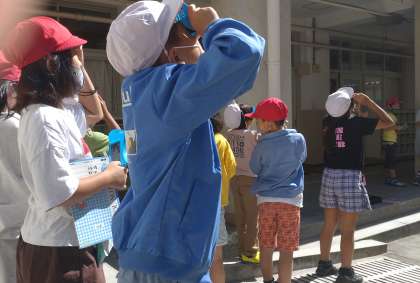 遮光板(しゃこうばん)を使って、太陽の観察をしました。 「先生、太陽が赤く見えます。」など子どもたちは、興味深く太陽を見ています。
