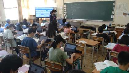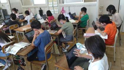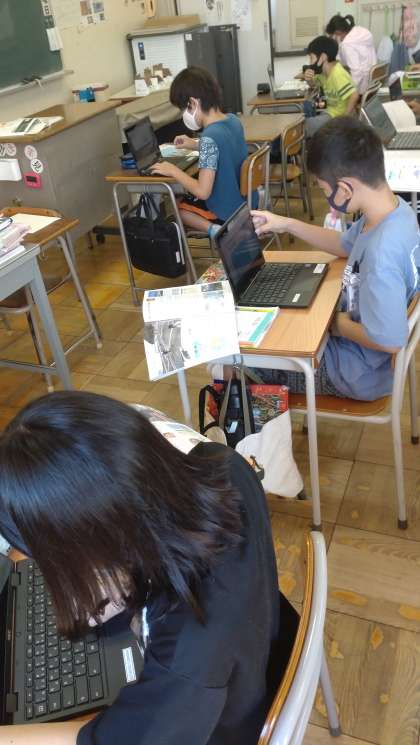 水産業のまとめの学習をしています。一人一台PCを活用して、日本の漁業についてまとめています。子どもたちは、タイトルやまとめの文章を真剣に考えています。