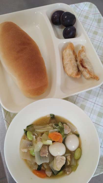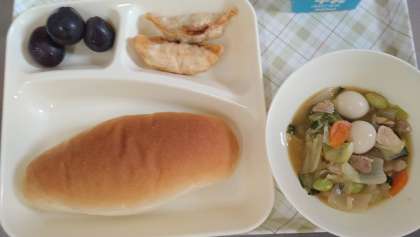 今日の給食は、あげぎょうざ、中華煮、ぶどう、パン、牛乳です。