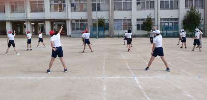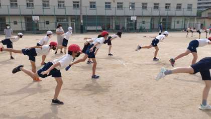 6年生が団体演技の練習に取り組みました。軽快な曲に合わせて、リズミカルに演技を行っています。