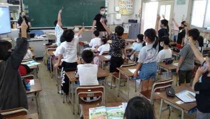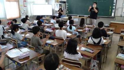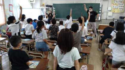 C-NETの先生と英語のゲームをしました。選んだ好きな色が歌詞に出てくる英語の歌に合わせて、リズムに合わせて、座ったり立ったりしました。子どもたちは、とても楽しく活動しています。