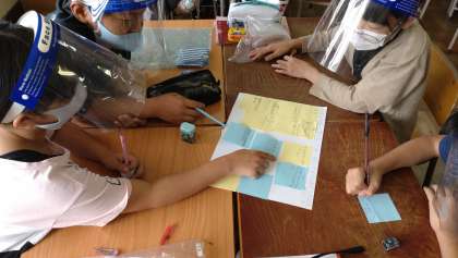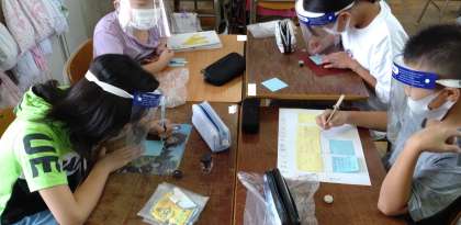 「話し合いの進め方」を学習しました。グループで、問題を確かめたり、その原因を考えたり、付箋紙を活用しながら話し合っています。
