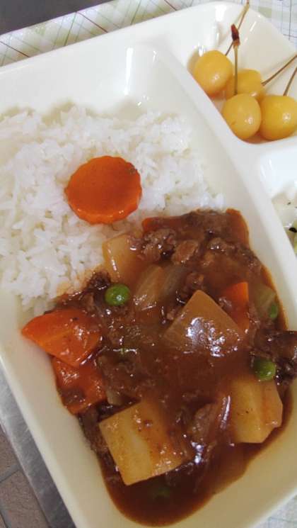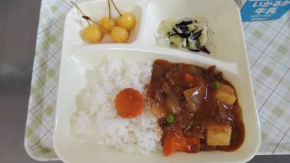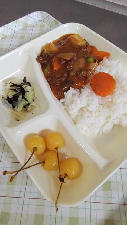 今日の給食は、ハヤシライス、キャベツのひじきドレッシング、さくらんぼ、牛乳です。
