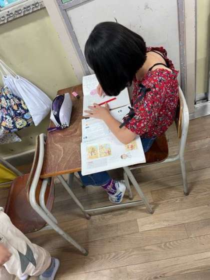 想像して物語をつくるを学習をしました。挿絵も描いて自分なりの物語を書きました。書いた物語を先生に提出しているところです。
