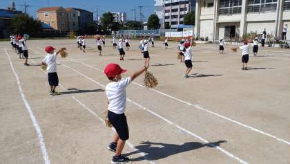 1年生の子どもたちが、とても一生懸命に運動会の練習に取り組んでいます。リズムに合わせて体をいっぱいに使って演技しています。入退場も全力です。