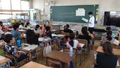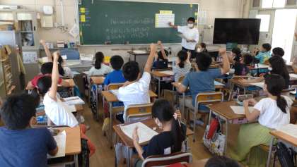 四則混合計算の学習のまとめをしています。計算のきまりを復習しながら、テストの答えの確認を丁寧にしています。
