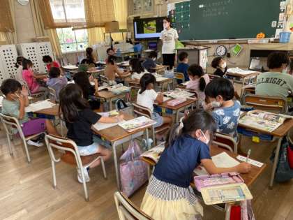生活科の時間に「教室のバッタ」の絵を描きました。教室にいるバッタを見ている自分とバッタの絵を描いています。