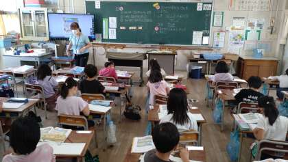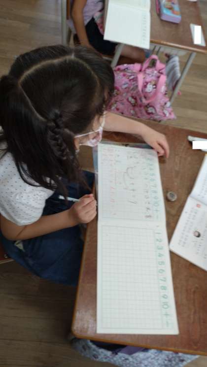 三つの数の計算を学習しました。文章問題から、5—2+4の立式をしました。前から順に計算していくきまりを学んで、課題を解決していきました。