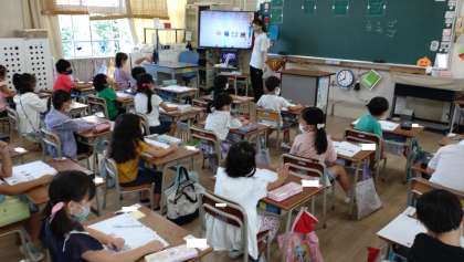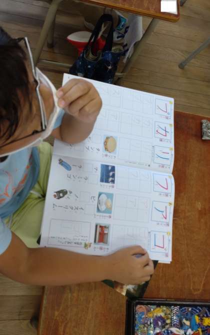 カタカナの学習をしました。「ア」「フ」などのカタカナを練習しています。「ゴ」のようなカタカナの濁音は、先生のお手本に合わせて、丁寧に書いています。「プ」などの半濁音も学んでいます。