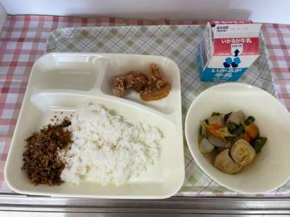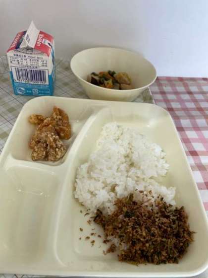 今日の給食は、鶏肉のたつたあげ、一口がんもと野菜の煮もの、おかかなっ葉、ごはん、牛乳です。