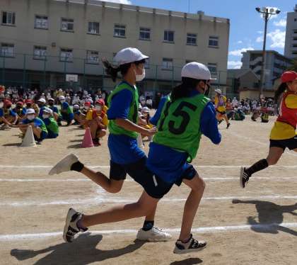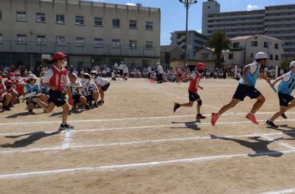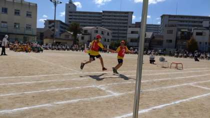 5・6年生は、リレー競技に取り組みました。バトンパスが勝敗の分かれ目です。待っている子どもたちもしっかりと拍手で応援ができていました。