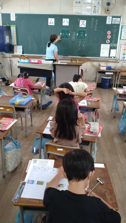 カタカナの学習をしました。この授業では、新しい「ス」「ハ」「ム」のカタカナを学んでいます。「ス」と「ヌ」など、間違えやすいカタカナについては、注意しながら練習しています。
