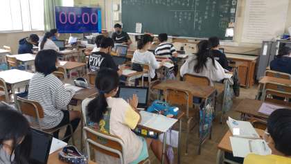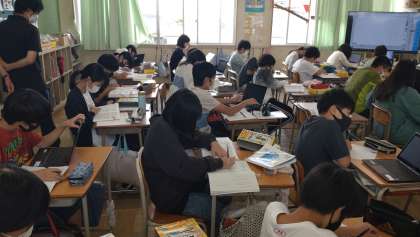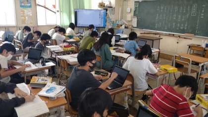 説明文「町の未来をえがこう 町の幸福論——コミュニティデザインを考える」の学習をしました。パソコンや辞書を活用して、語句の意味調べに取り組んでいます。