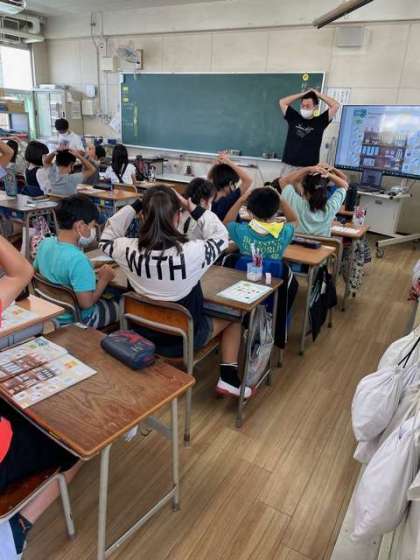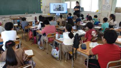 身の回りの道具の名前を学習しました。「Do you have 〜」のフレーズの学習をしました。道具の名前を先生がいったらそれを先におさえるゲームをしているところです。動画を見て、外国の子どもたちの持っている学習用具も学んでいます。