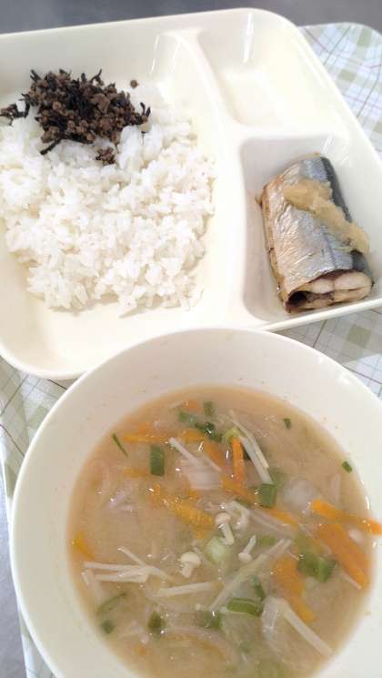 今日の給食は、さんまのみぞれかけ、みそ汁、牛ひじきそぼろ、ごはん、牛乳です。