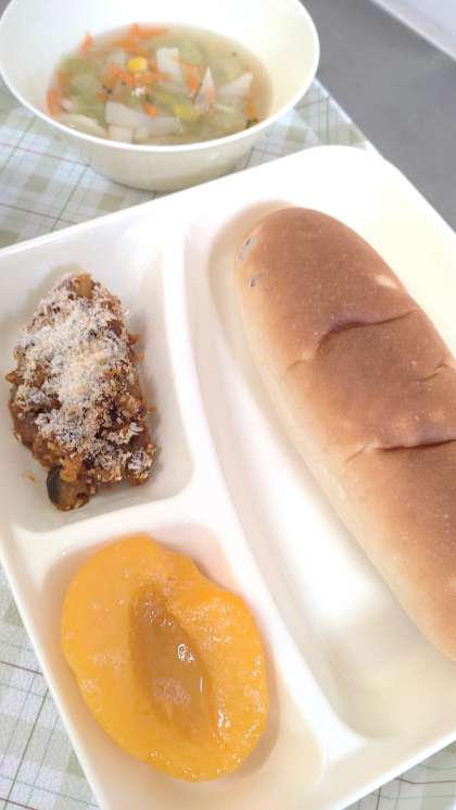 今日の給食は、なすのミートグラタン、鶏肉と野菜のスープ、黄桃、パン、牛乳です。