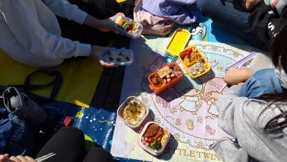 お弁当の時間です。お天気もよく青空の下、海を眺めながらお弁当を食べました。