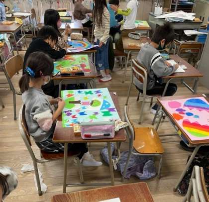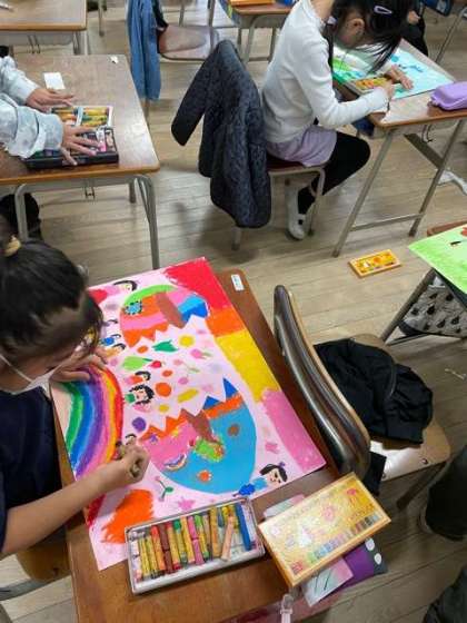 図画工作で「ひみつのたまご」を描きました。想像して楽しいたまごの絵を描きました。