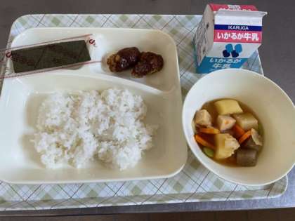 今日の給食は、みそカツ、じゃがいもと野菜の煮もの、焼きのり、ごはん、牛乳です。