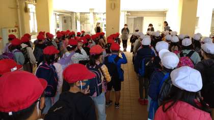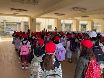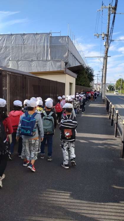 1・2年生の子どもたちが先生からの諸注意を聞いた後、服部緑地に向けて出発しまとした。