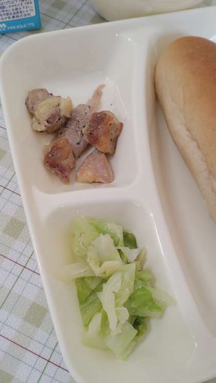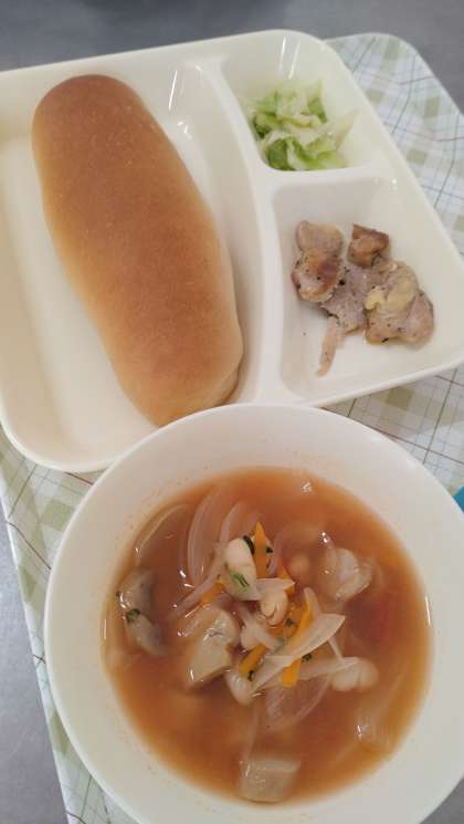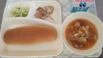 今日の給食は、鶏肉の香草焼き、ウインナーとてぼ豆のスープ、キャベツのガーリックソテー、パン、牛乳です。