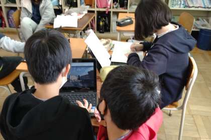 「未来をイメージする」をテーマにプレゼンテーションをつくっています。インターネットや資料を活用して、グループで調べています。