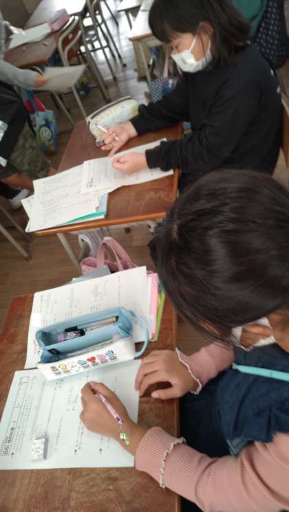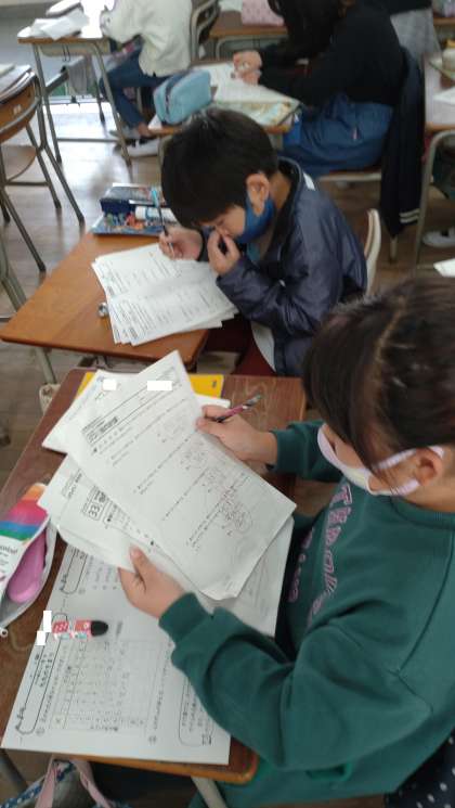 プリントで学習の振り返りをしました。「倍の計算」などの文章問題を繰り返し学習しています。