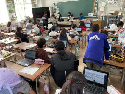 国語科でパラリンピックについてパソコンで調べました。調べたことをまとめ書いているところです。