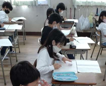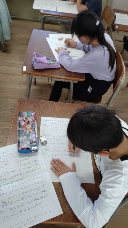 説明文を書く学習に取り組んでいます。パッチンジャンプの遊び方について説明する文を書いています。下書きから丁寧に清書しています。