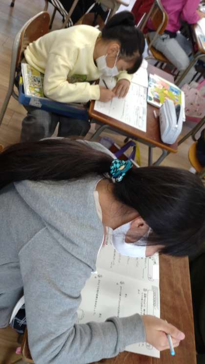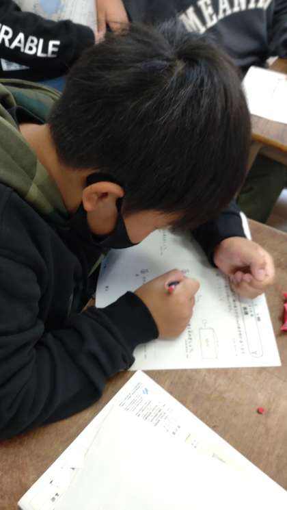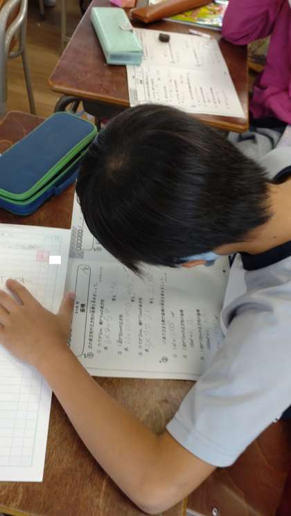 算数プリントで復習に取り組んでいます。面積の学習を振り返って、課題を解いています。