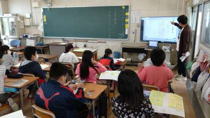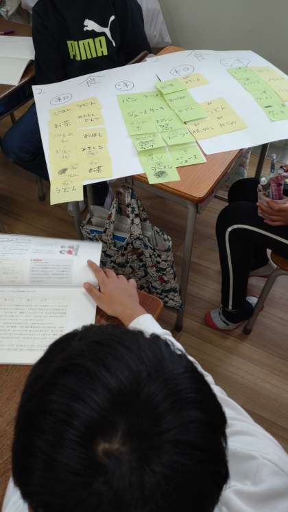 和と洋の食事について話し合いました。調べたことを整理してまとめていきます。付箋紙を上手に活用して話し合っています。
