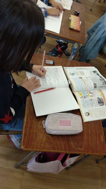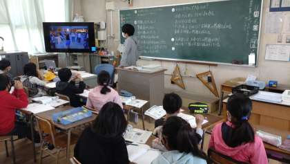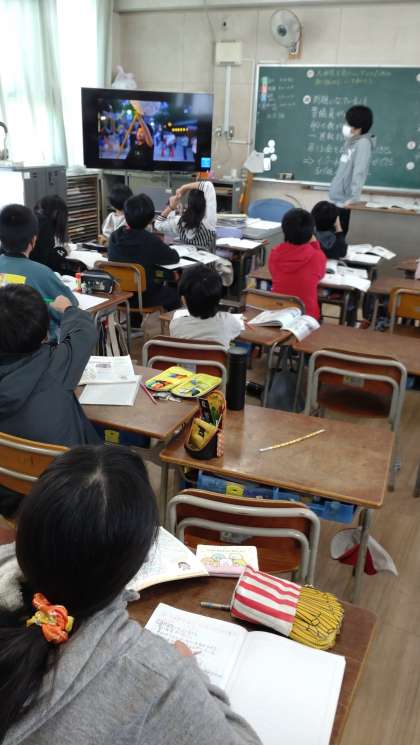 天神祭りについて学習しました。問題になっていることや自分たちができることを調べて、話し合いました。写真は、動画を見て、お祭りの様子を調べている様子です。
