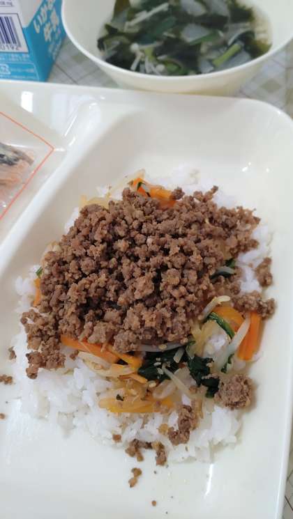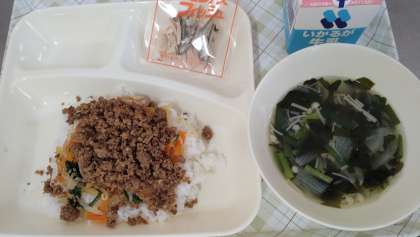 今日の給食は、ビビンバ、わかめのスープ、アーモンドフィッシュ、牛乳です。