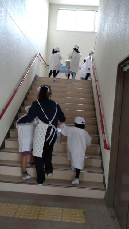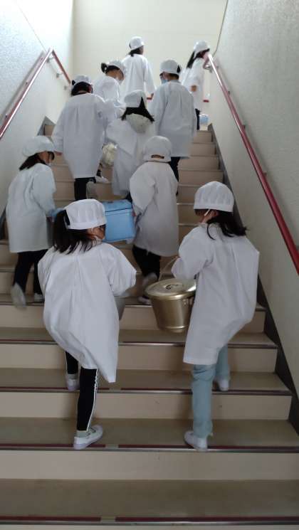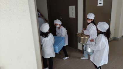 1年生が一生懸命に、給食の食缶や牛乳を運んでいます。