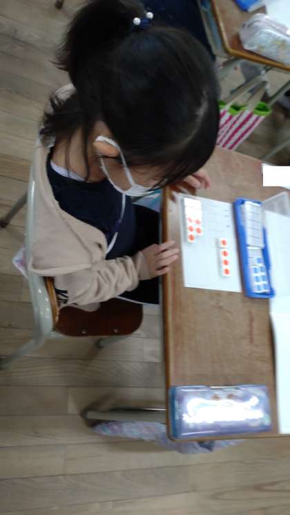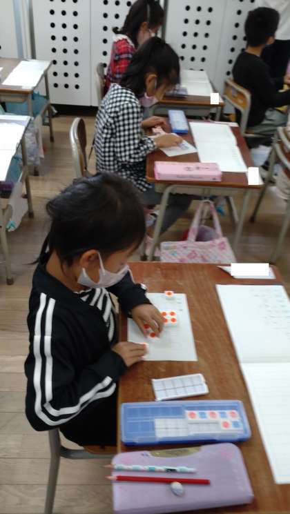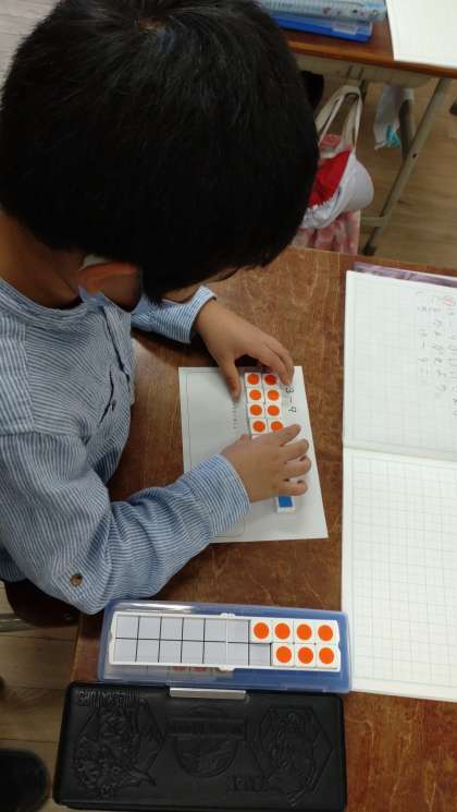 数図ブロックを使って、計算の仕方を考えています。10のまとまりからひく計算の仕方について学んでいます。