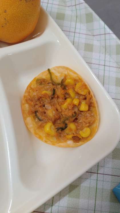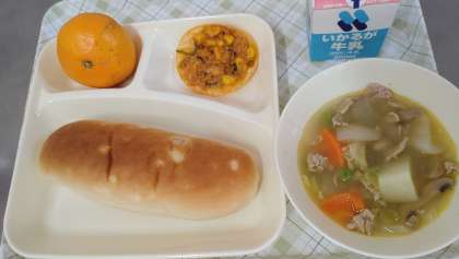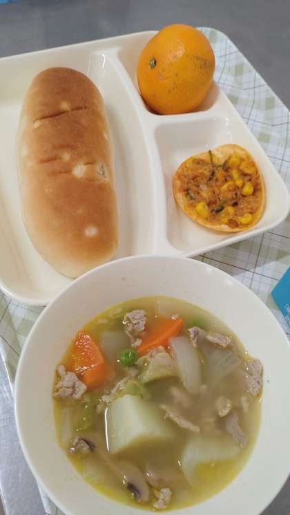 今日の給食は、豚肉と野菜のスープ煮、変わりピザ、みかん、パン、牛乳です。