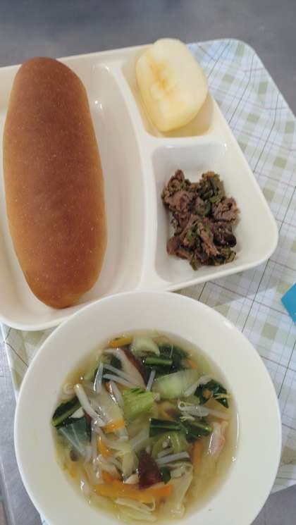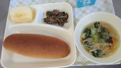 今日の給食は、牛肉のオイスターソース焼き、中華スープ、りんご、パン、牛乳です。