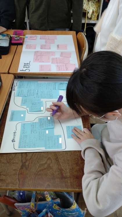 各グループのプレゼンテーションの感想をまとめています。付箋紙を活用してグループ話し合っています。「聞き取りやすさ」「資料の多さ」「イメージ」など、付箋紙に書いた意見を同じグループで集め、まとめています。