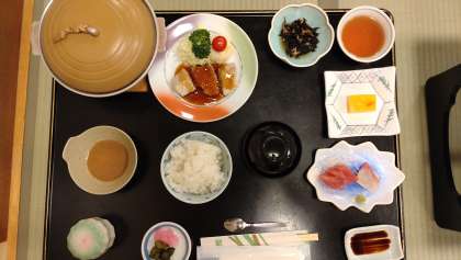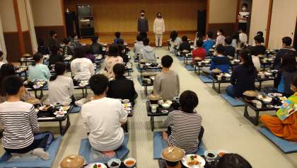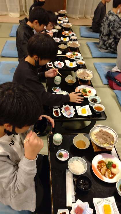 夕食の時間です。感染対策のため、みんな同じ方向に向いて、黙食でいただきました。