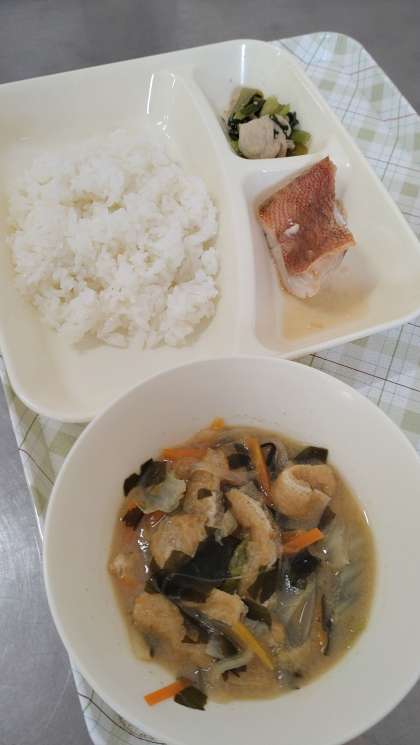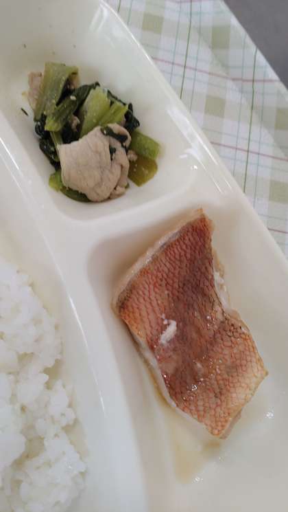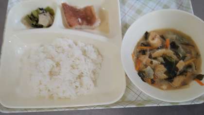 今日の給食は、さごしのおろししょうゆだれかけ、みそ汁、こまつなのいためもの、ごはん、牛乳です。